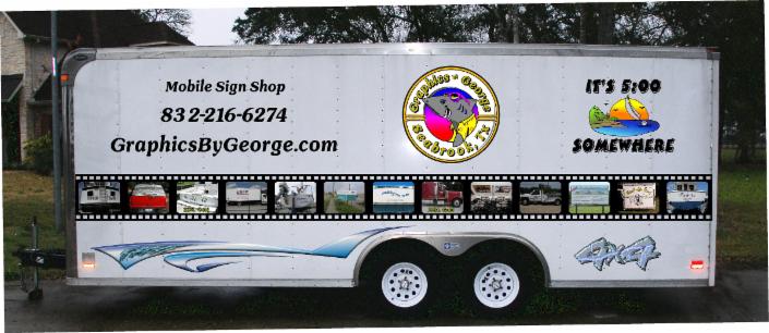 Welcome to The Graphics by George, Inc. website. We have been located in Seabrook, Texas serving the Clear Lake - Galveston Bay area since 2001 and have a complete mobile shop to better serve our customers at their location. Our primary business has consisted of boat names, lettering and graphics along with vehicle graphics and business signs. With the purchase of a Roland SP-300 Eco-Solvent printer we can offer full digital outdoor graphics with a life span of 5-7 years. This site will contain information on how to contact us as well as a photo gallery. please feel free to call with any question you may have. Boat names, Boat lettering, boat striping, boat graphics, vehicle graphics, registration numbers, Kemah, Seabrook, League City, Texas, La Porte Texas, Houston Texas, Freeport, Galveston, Pasadena, Deer Park